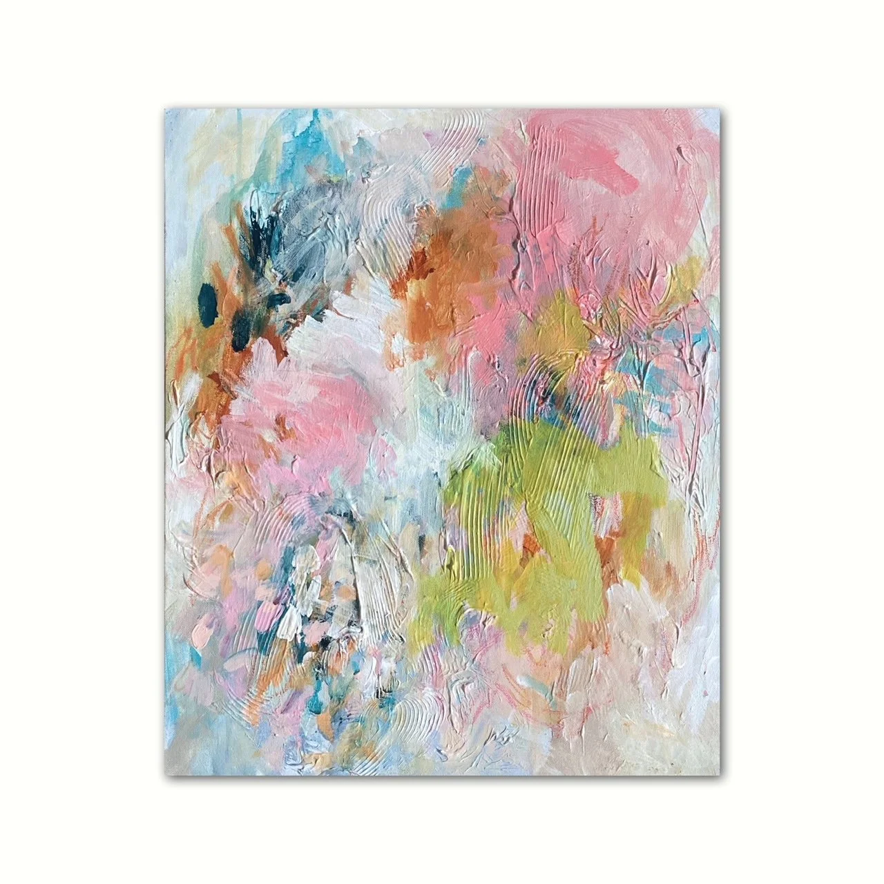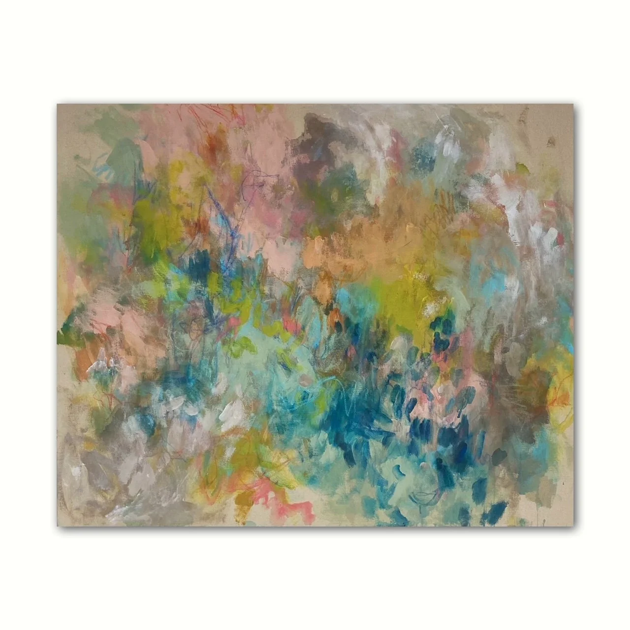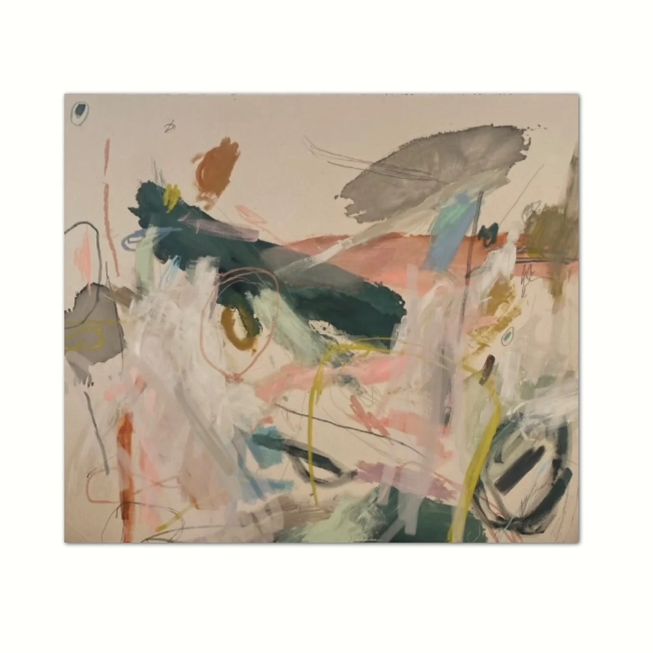 MIXED MEDIA ON CANVAS, FRAMED IN CREAM